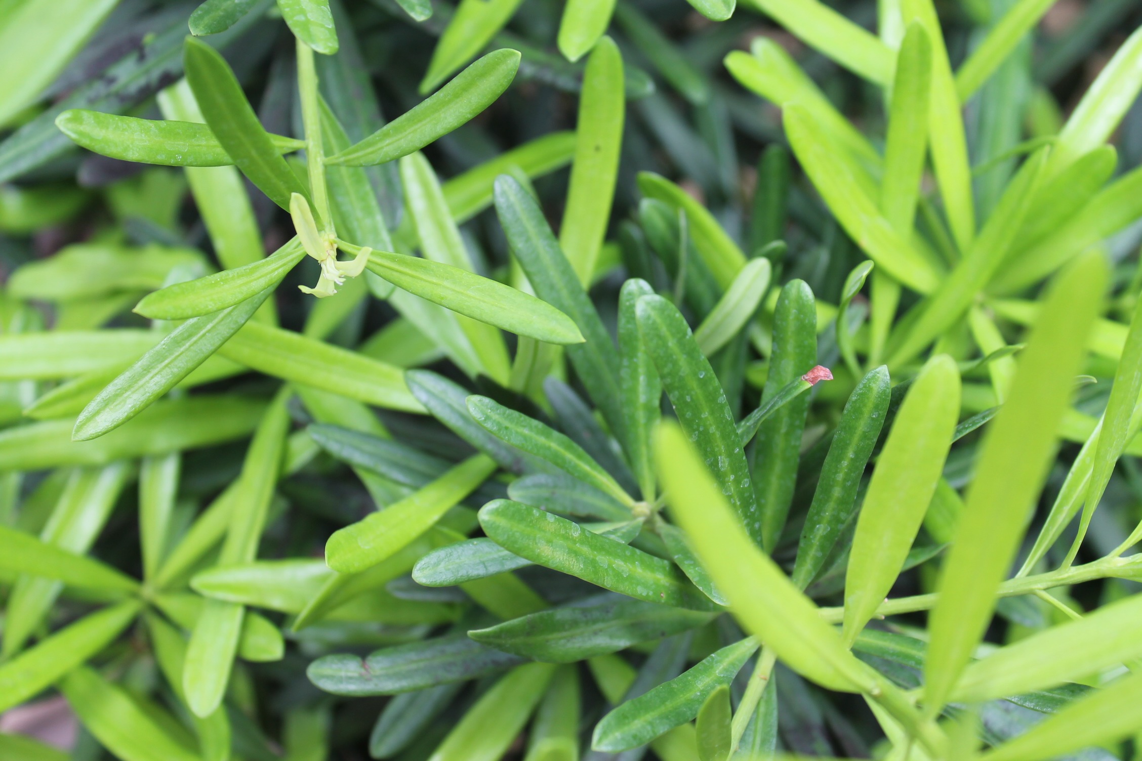 叶:叶在枝上丛生,具短柄或无柄,叶片呈线形,长 1-2.5 厘米,宽 0.1-0.2 厘米,前端钝,基部狭窄,全缘,革质,干燥后呈针状,上面稍具光泽,接近无毛,下面密被白色星状绒毛。