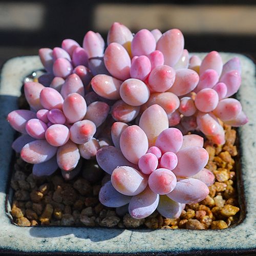 叶片特征:叶卵形至球形,长约 3-4 厘米,厚约 10-18 毫米,灰绿色,表面覆盖着一层厚厚的白粉。在温差大、日照时间长的环境下呈现粉色。
