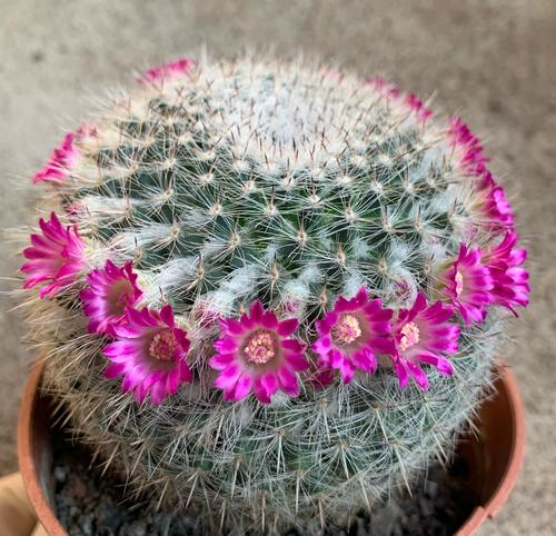 形态特征:植株幼时呈扁球形或球形,后长成圆筒状,直径 10 厘米左右,球体为淡绿色。疣状突起呈圆锥形,外层有白色绵毛覆盖,使整个球体呈银白色绵毛球。每个刺座有白色周刺 20-30 根,长 0.5-1.5 厘米;有尖端为褐色的中刺 2-3 根,长 1.5-2 厘米。球顶有漏斗形紫红色小花,花径为 1.5-2 厘米。果实为紫粉色,种子黑褐色。