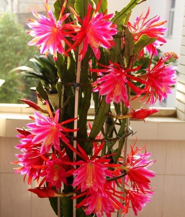 形态特征:常呈灌木状,株高可达 2 米。茎直立,多分枝,高约 50-100 厘米。基部主干细圆,分枝扁平呈令箭状,绿色,边缘呈钝齿形,齿凹入部分有刺座,具 0.3-0.5 厘米长的细刺。花从茎节两侧的刺座中开出,花筒细长,呈喇叭状,花大,白天开花,夜晚闭合,一朵花仅开 1-2 天,花色有紫红、大红、粉红、洋红、黄、白、蓝紫等,花期为 4-6 月。