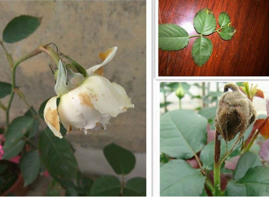 6.温度过高,导致的月季嫩叶卷曲,垂头,易盲枝,叶子颜色变淡,伴有一定程度的焦黄,并随机的叶枯。病因,休眠时(30+)过多浇水,温度过高(35+)时浇水闷热导致,盆小温度时伤根。防治措施,遮阴,通风,高温不浇水,套盆。
