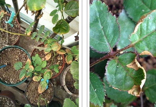 17.月季肥伤症状:嫩叶失绿发白继而枯黄,老叶叶尖以及叶边缘呈现枯黄色、褐色。施肥过勤、浓度过高、使用未经腐熟的有机肥、购买假冒伪劣药物导致。防治措施:平常薄肥勤施,发生肥伤时,轻度则灌水稀释,重度则挖出来洗根。