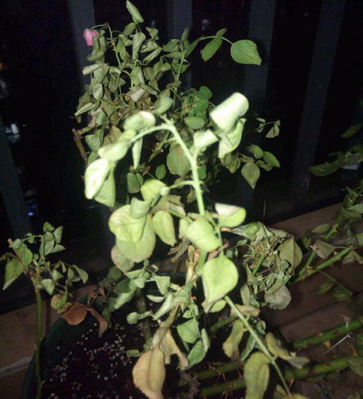 4.月季长时间缺少光照的症状,整株叶片颜色慢慢变淡、变黄直至脱落。防治措施,慢慢增加光照时间以及光照强度,循序渐进,切勿操之过急。