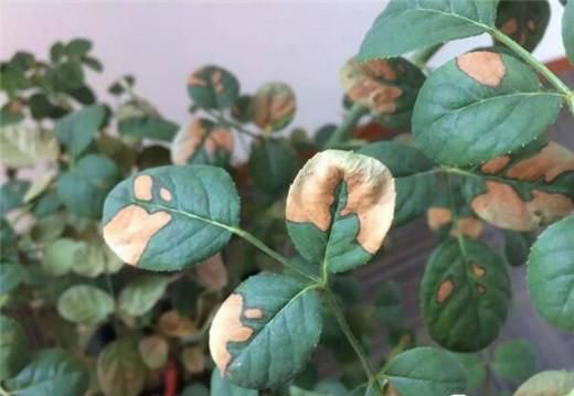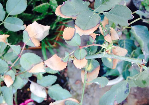 5.紫外线灼伤,喷水后暴晒,缺水或者蒸腾作用过大导致输送不及导致的月季晒伤,症状是叶边缘泛黄直至焦枯。防治措施,夏季高温时(35+)先遮阴少量浇水,等土壤温度下降后(叶子复挺)再浇透,遮阴 ,放置通风处防闷伤。