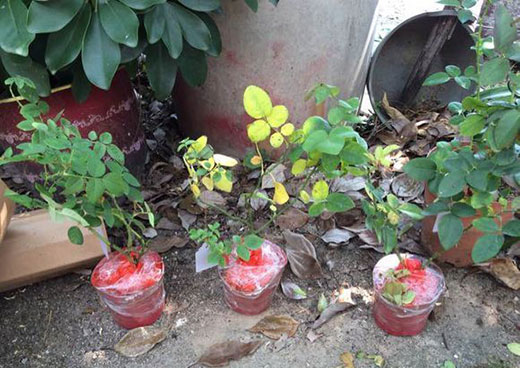 7.温度过低月季枝叶自上而下开始颜色变红(红色系较为明显),生长停止,逐步开始黄叶落叶,大部分品种月季5度下休眠期的正常现象,可用套盆以及铺干草等防冻。