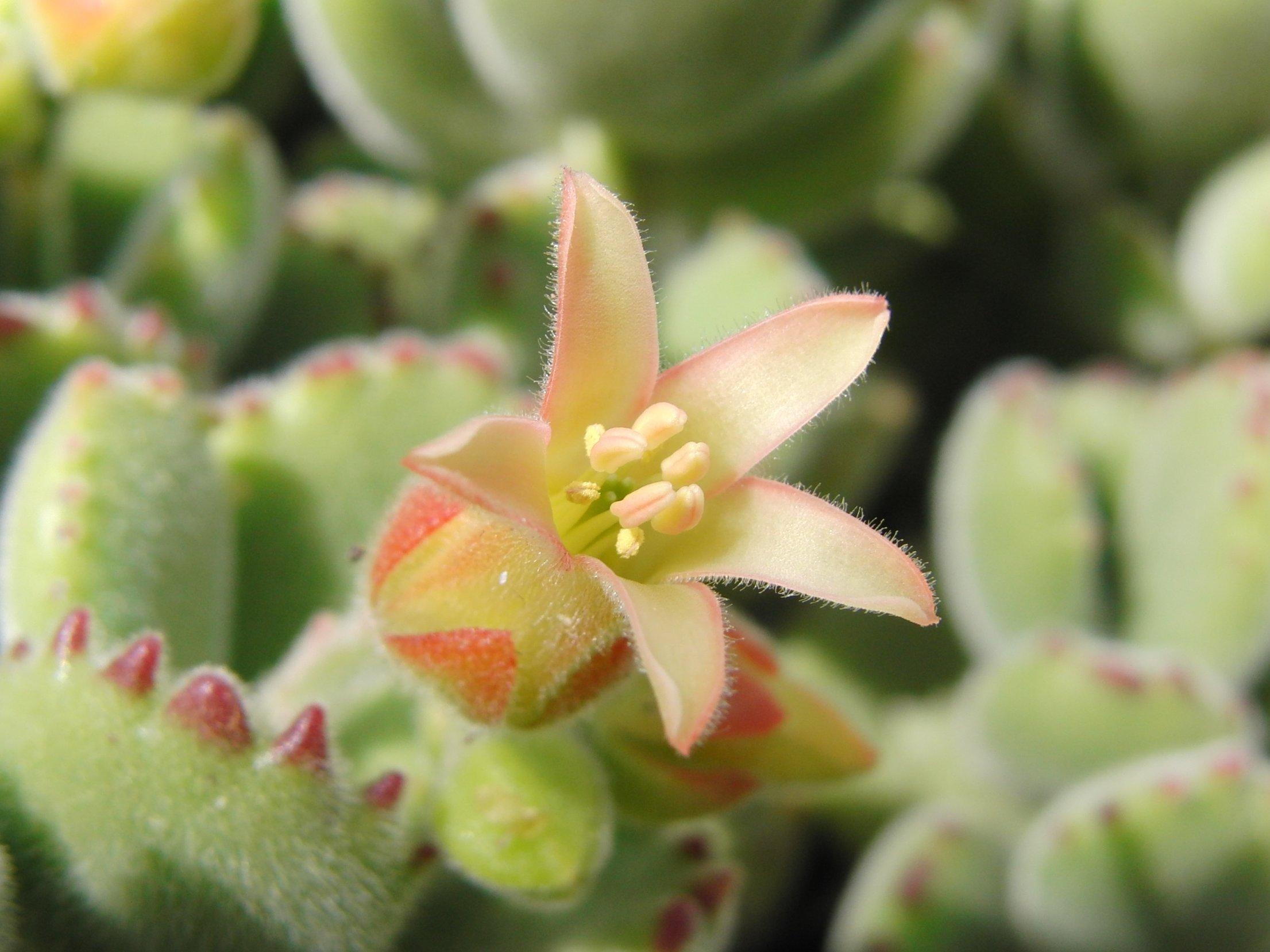 形态特征:植株多分枝,呈矮小灌木状,高 30 厘米左右,株幅 11-12 厘米。茎绿色,肉质叶肥厚,交互对生,为倒披针形至长卵圆形,扁匙状,长 2.3-6.5 厘米,宽 1.5-3.2 厘米。叶表密生白色极细短绒毛,叶端具红色爪样齿,形似小熊的脚掌。二歧聚伞花序,长 16-20 厘米,花茎红色,小花黄色,花期 7-9 月。
