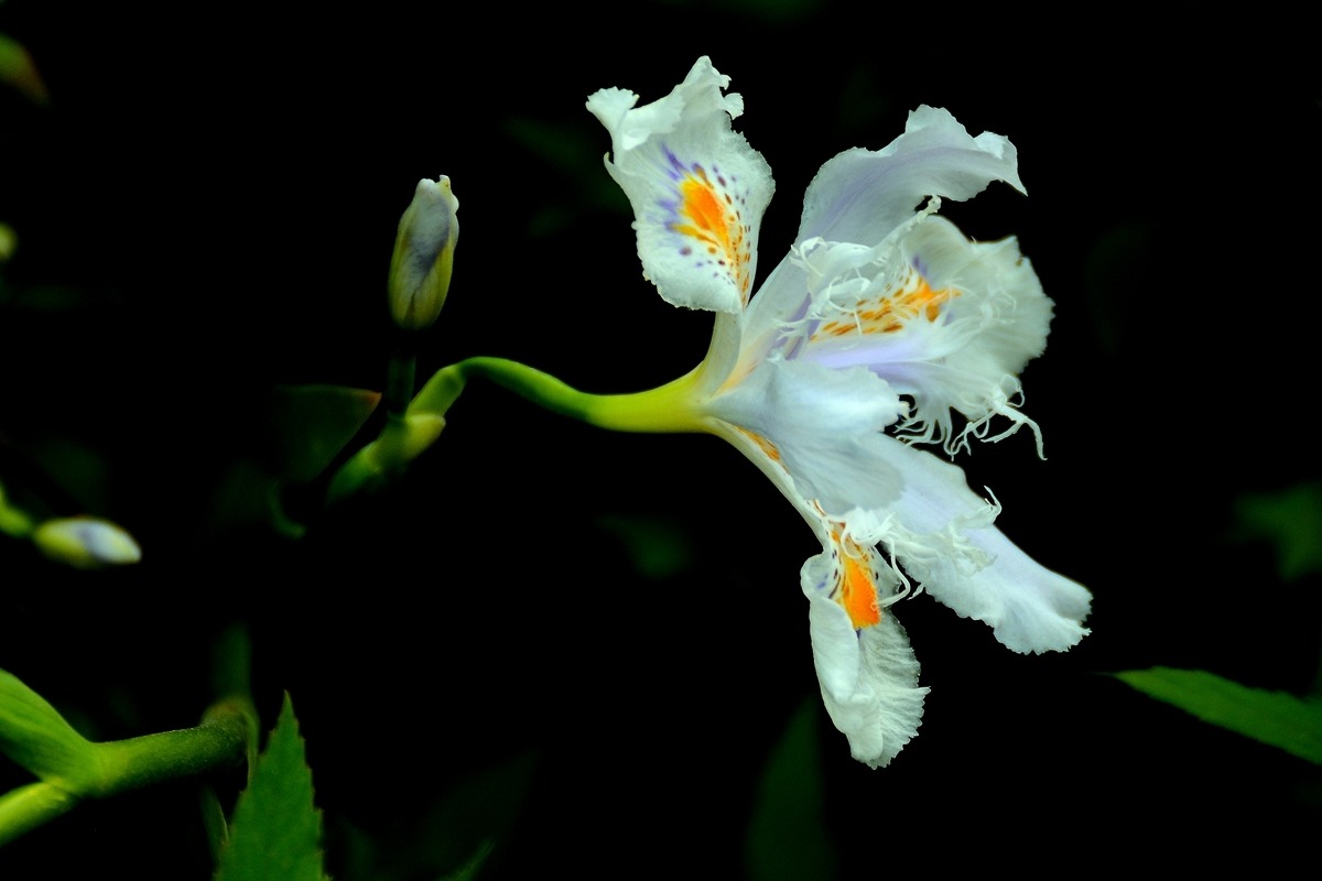 花朵:花大型,直径可达 10 厘米以上;萼片与花瓣洁白,有时带淡粉晕,唇瓣白色,中裂片有明显的黄色斑块,偶见紫粉色斑点;具清新的丁香香气,花期 2-5 月,单株花期能达 1 个月左右。