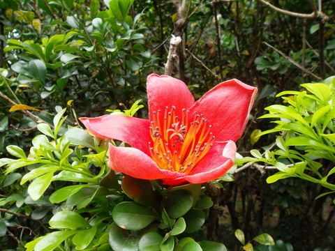 花:花期 2-4 月,先花后叶,花簇生于枝端,花大且呈红色或橙红色,花瓣肉质,形状别致。