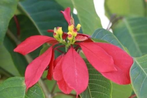 观赏部位:日常看到的 “红花” 并非花瓣,而是顶端的变态叶(苞叶);真正的花是苞片中央黄绿色的杯状花序,非常细小;苞叶常见为鲜红色,也有白、粉、黄、橙等园艺品种,花期集中在 11 月至次年 3 月,正值圣诞、元旦、春节期间。