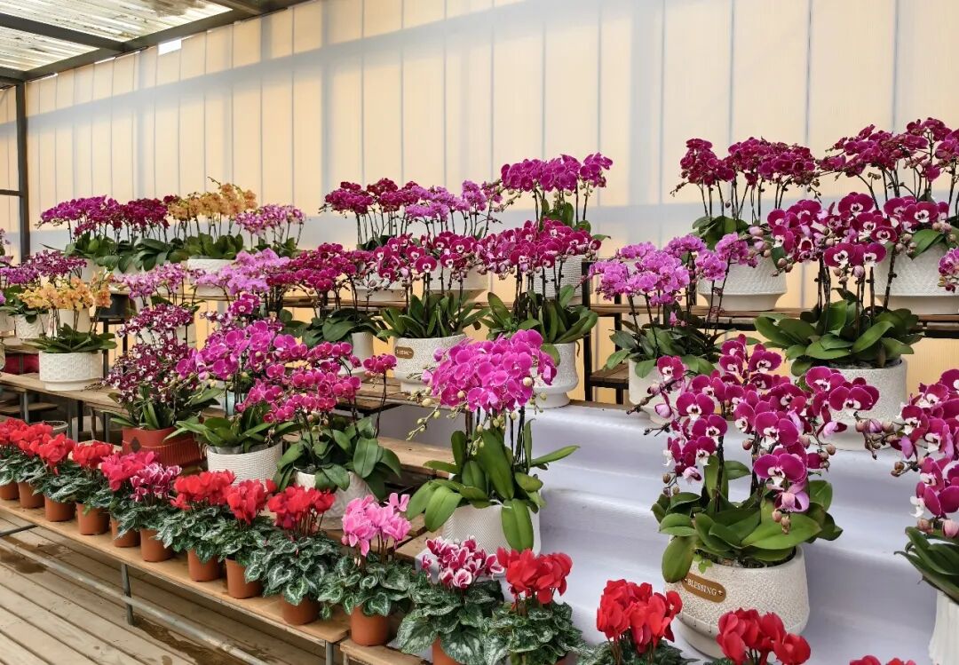除了蝴蝶兰,园内还有十多种年宵花争奇斗艳。寓意“喜迎贵客”的仙客来、“健康长寿”的长寿花、清雅芬芳的水仙等,能满足不同审美与寓意的需求。同仁章花卉园作为溧水区目前规模最大的花卉展销基地,园区占地达500亩,共提供80多种花卉绿植,集花卉展示、果园采摘、休闲垂钓等多个功能于一体。