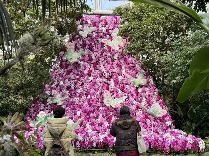 热带植物馆的蝴蝶兰立体花瀑更是吸睛,粉紫白三色蝴蝶兰沿高处垂落,蝴蝶造型点缀其间,阳光透过阔叶林缝隙洒落,营造出如童话森林般的唯美意境,成为游客拍照打卡的热门点位。