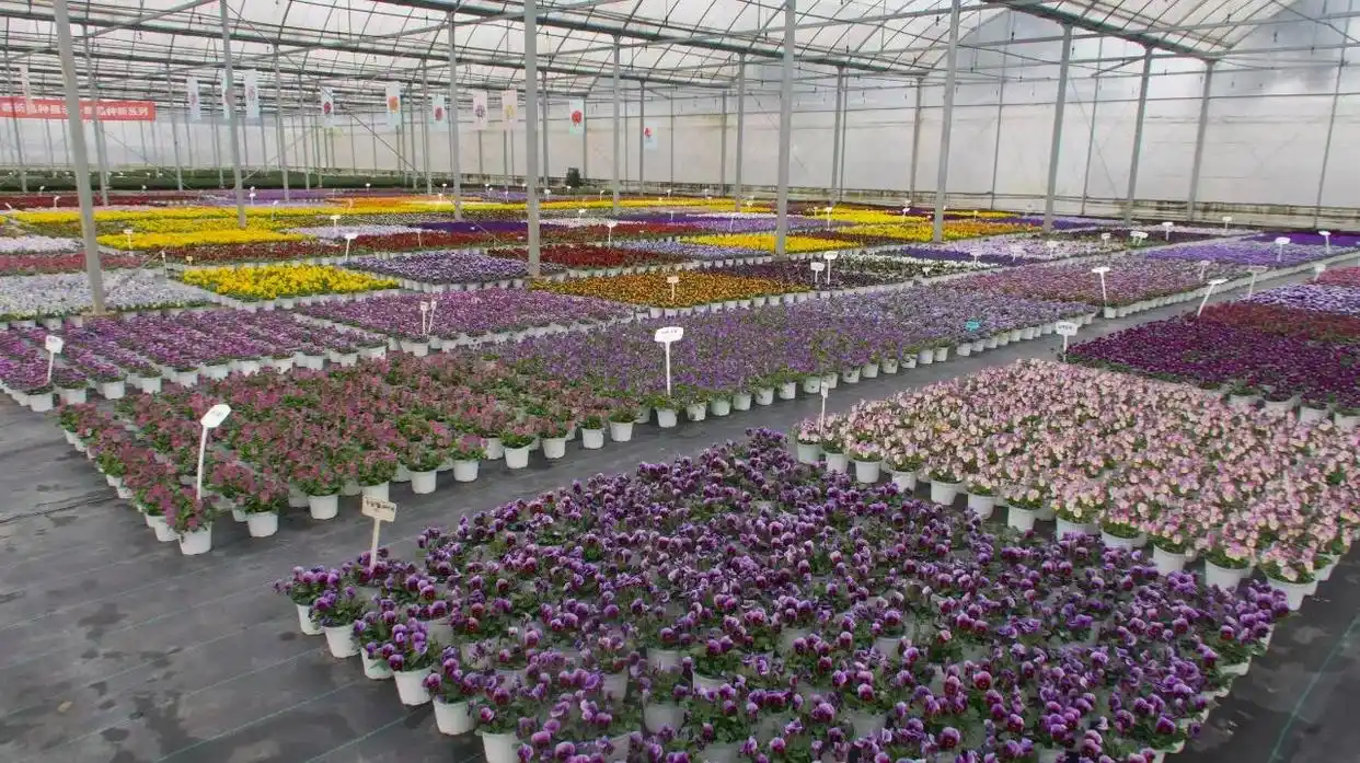 "现在基地主打角堇品种,产量能达到 200 多万盆,三色堇保留了 50 万盆左右的规模。" 合作社董事长史纪金的介绍,道出了产业发展的新变化。2022 年起,基地完成了一次脱胎换骨的升级 —— 老式单体棚被 "8424 型" 现代化联动温室取代,不仅解决了传统大棚使用面积小、高度不足、降温困难的痛点,更实现了智能化管理与空间高效利用。在栽培基质持续创新的同时,基地还开辟了零售区域,绣球、绿萝等丰富品种,让市民能一站式挑选到适合阳台摆放、室内装饰或庭院点缀的花卉。