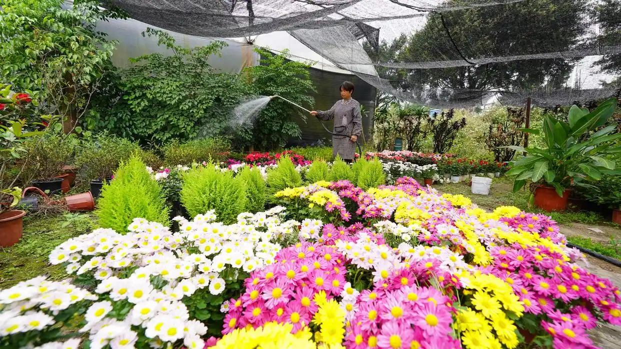 12月18日,在贵州省黔东南苗族侗族自治州榕江县古州镇古榕社区一花卉种植大棚里,工人对各种花卉进行管护。