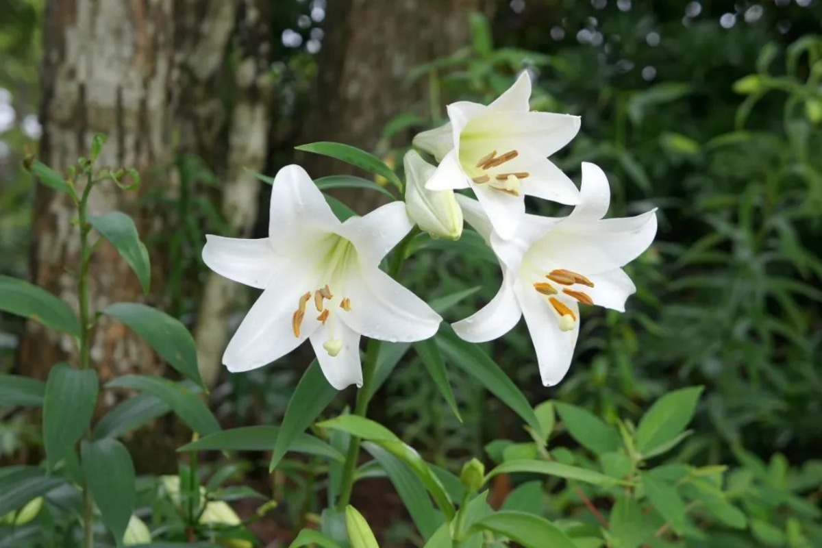 形态特征:百合茎高 0.7-1.5 米,有紫色条纹。叶散生,倒披针形,全缘。花 1-4 朵,呈喇叭形,有香味,花被片 6 枚,多为白色,背面带紫褐色,顶端弯而不卷。蒴果矩圆形,具多数种子。其鳞茎球形,直径约 5 厘米,鳞茎瓣广展,无节,白色。