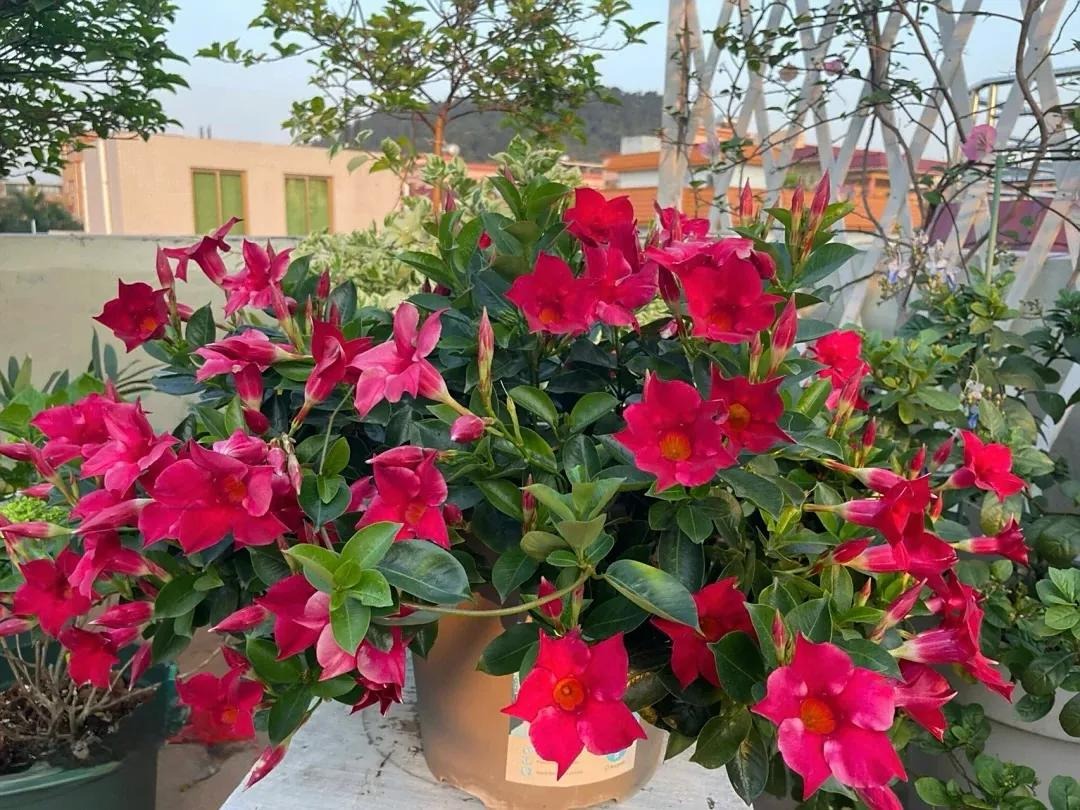 形态特征:叶片对生,全缘,长卵圆形,先端急尖,革质,叶面有皱褶,叶色浓绿且富有光泽。花腋生,花冠漏斗形,花径可达 6-8 厘米,颜色丰富,有红色、桃红色、粉红色等。